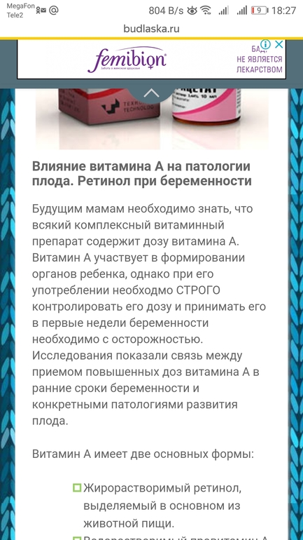 Медикаменты, витамины, процедурыДевочки привет. Кто пил с первой недели беременности Фемибион витамины? Не навредят ли они? Купила Элевит 1первый триместр, пропила 5 дней но прочитала в интернете что витамин А категорически нельзя на ранних сроках. Кто пил Элевит или Фемибион именно с самых малых сроков беременности? Напишите пожалуйста.