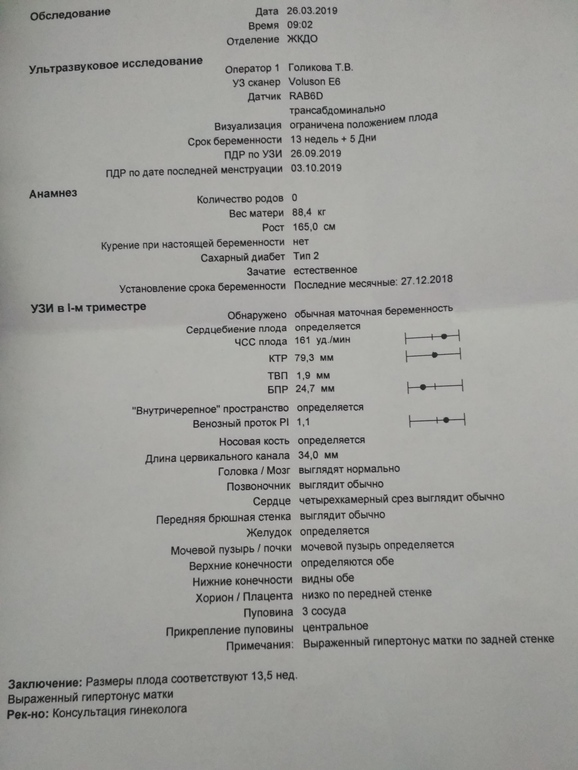 Наш первый скрининг прошел, не знаю по результатам хорошо или нет . Помогите разобраться в данном УЗИ по нормам, БПР, ТВП, КТР. У кого была на сроке 13,5 нед. плацента низко по передней стенке-это слишком страшно. И ещё выраженный гипертонус матки по задней стенке, пью Утрожестан уже давно, но не помогает.