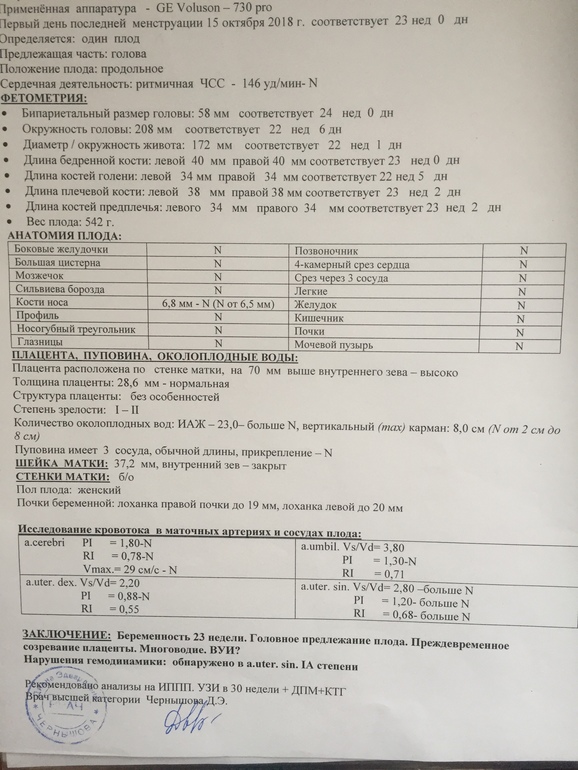 УЗИ, КТГ, доплерПосле 2 скрининга в 20 недель поставили выраженное многоводие (ИАЖ 24,5), Г назначила вильпрафен 1т/3 р. в день на неделю, но я пропила 5 дней по 2, т.к. из-за этих таблеток были ужасные проблемы со стулом. В 23 недели пошла на УЗИ промониторить ИАЖ. В итоге воды стало меньше - 23, но все равно ближе к верхней границе нормы, поэтому опять ставят многоводие. (по таблице на этом сроке нормы ИАЖ 90-23,7). Вроде успокоилась, но теперь новая проблема-плацента 1-2 степени зрелости, нарушение кровотока в левой маточной артерии 1А степени. Специалист на УЗИ сказала что катастрофически страшного ничего нет, отклонение незначительное, степень лёгкая, ребёнок развивается в срок, но я все равно теперь дико переживаю, ещё как обычно начиталась всякого в интернете.. Ещё неделю назад начала снижать дюфастон, который пила с 7 недели по 2 т. в день (каждые 7 дней снимаю 0,5 т). Не могла ли отмена так повлиять на плаценту и кровоток? Девочки, подскажите, кто сталкивался с такими проблемами, чем лечили? На приём к своему Г только через пару дней попаду, а сейчас сижу в неведении и с ума схожу. Фото УЗИ прикрепляю.