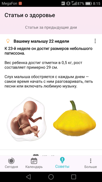 А у меня на телефоне приложение есть flo, я по нему раньше мес отмечала и пыталась овуляцию отслеживать, а сейчас в режиме беременности оно мне каждый день информацию про ребенка на этом сроке, про самочувствие и разные советы пишет. Вот по Вашему вопросу что было