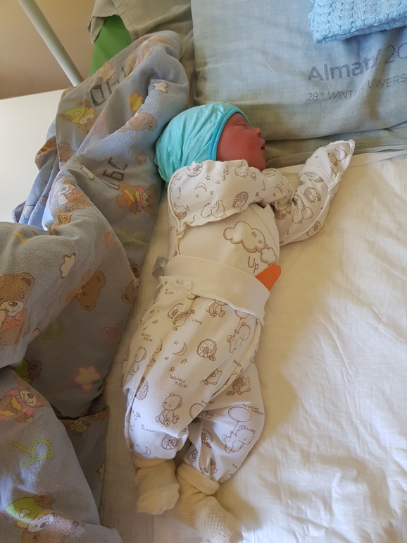 Вчера я траванулась кукурузой - рвота и понос всю ночь, плюс ко всему схватки добавились. Мучалась, а шесть утра решила вызвать скорую, тк болело уже не по детски. Мой роддом закрыт на ремонт, увезли фиг пойми куда, но все прошло гораздо лучше чем я думала. Раскрытие при поступлении 4см, слили воду - очень мутные и зелёные. Но вот уже в 7.50 я его родила. Первым малыша взял муж, дал мне отдохнуть 15 минут, а то я после отравления вообще без сил лежала.