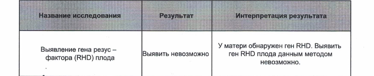 Всю жизнь у меня 1 отрицательная кровь, поэтому решила сразу сдать анализ на определение резуса плода. В итоге получаю вот такой результат.