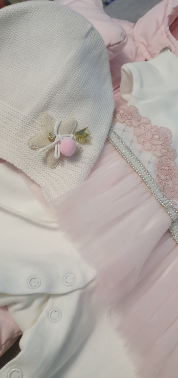 На выписку в фотографиях есть, тёплый мешок со слипом белым с розовой юбкой нашитой