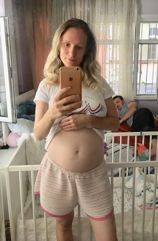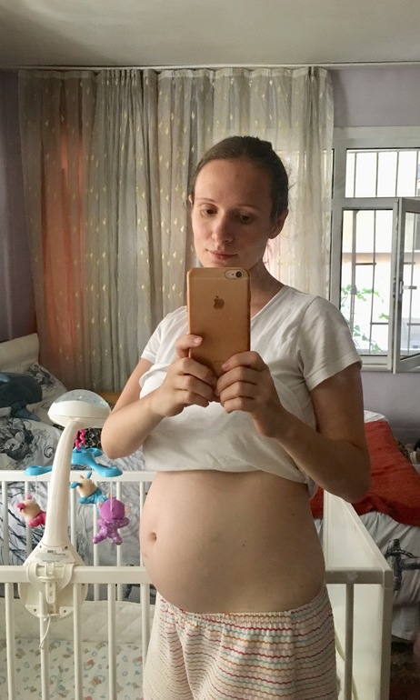 Живот кажется уже подпирает желудок. Иногда после еды вздохнуть тяжело. Есть приходится мало и часто. Крошка заботится о мамином весе😂. Лежит там, видимо, как морская звезда (муж так спать любит). Кстати, вес. Сейчас примерно 57,7-58 кг. Это ок 1 кг от добеременного (но до 54 кг сбрасывала в разгар токса). Думаю, грудь еще много весит.