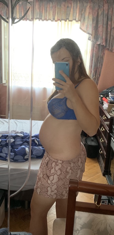 Какой аккуратный животик. У меня такой недель в 26 был. А под конец огромный вырос, обувь сама практически не могла натянуть, дети помогали и чулки по вечерам тоже снимали с меня.