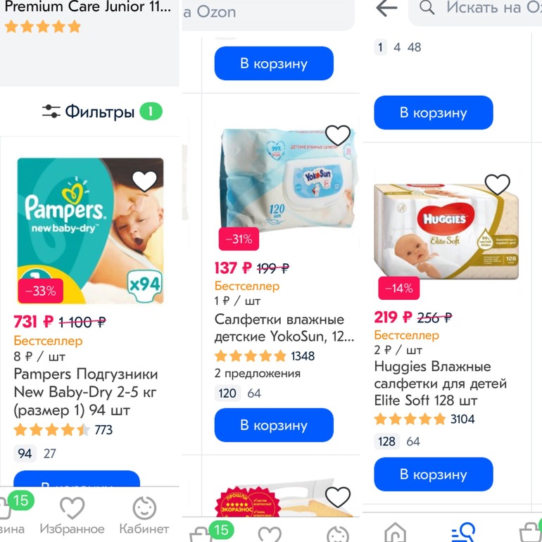 Зашла на озон посмотреть по чем подгузники.. короче взяла пачку памперсов 94шт и две пачки салфеток по 128шт (фотки прилагаются) - заплатила за все это добро 650р примерно. Выходило где-то а 1200 с доставкой, но у меня ещё бонусы Сбербанка были.