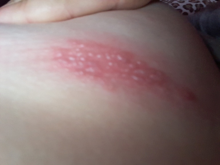 Не опасно, это герпес зостер , ветряночный вирус, но если вы будете болеть когда рожать будете это очень плохо, можете заразить ребенка и это очень тяжёлое течение