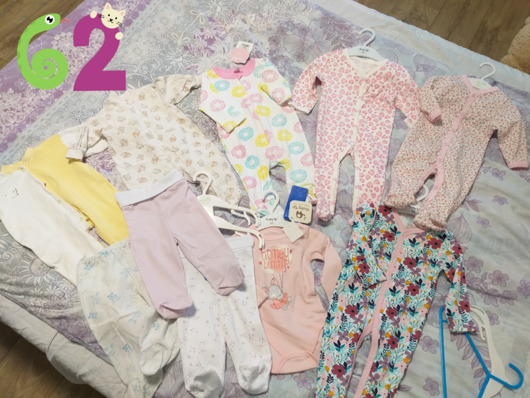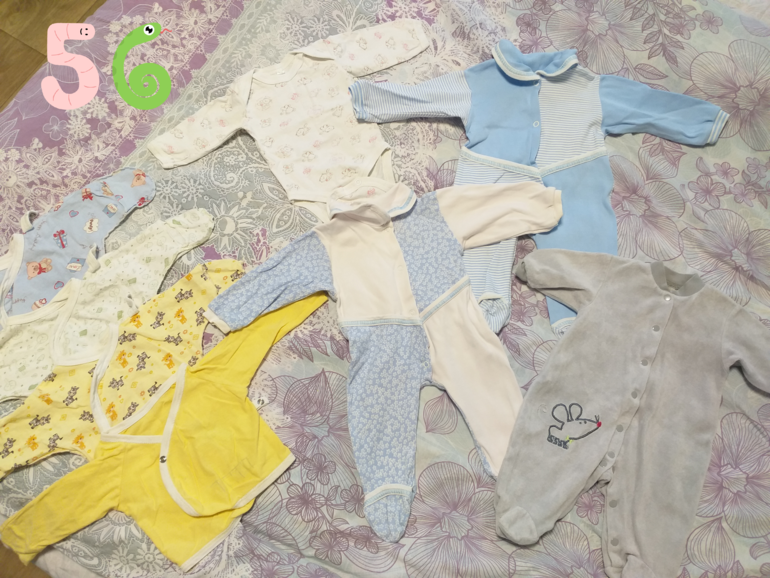 На каждый размер желательно не менее 10 комплектов одежды. Если не хотите каждый день стирать. Потому что за день ребёнок легко может 6 слипов испачкать. Отрыгнуть, памперс протек...