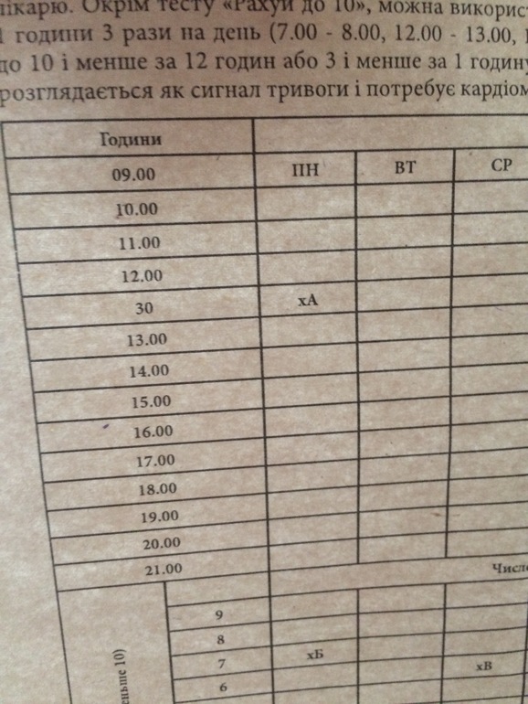 Если за день было меньше 10 шевелений, то заносите в нижнюю табличку. Было, например, 5. Ставите крестик где вторник и 5шт