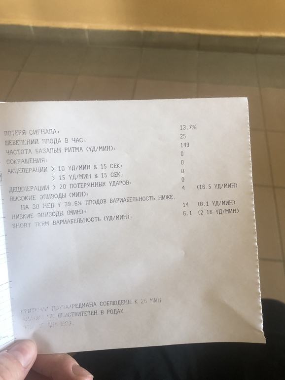 Плацента по передней стенке, долго настраивали, чтобы услышать ритм. И пришлось все время держать рукой датчик, рука, естественно , затекала, несколько раз отпускала датчик- терялся сигнал