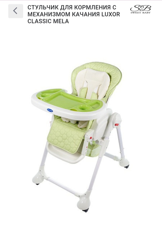 Я купила стул-шезлонг с функцией качания sweet baby classic. Подкупило, что шезлонг для младенца не на уровне пола, а гораздо выше (5 положений по высоте). У него на любом уровне есть функция качания - маятник назад-вперед. Да, качать рукой, но, по отзывам, многим хватает и этого. Поглядим) Подкладка хлопковая мягкая, но плотная (потеть не так будет), основной чехол экокожа. Раскладывается на 170 градусов. Съёмный поднос, пятиточечные ремешки безопасности. Нелегкий, но катается неплохо. Тяжёлый, конечно