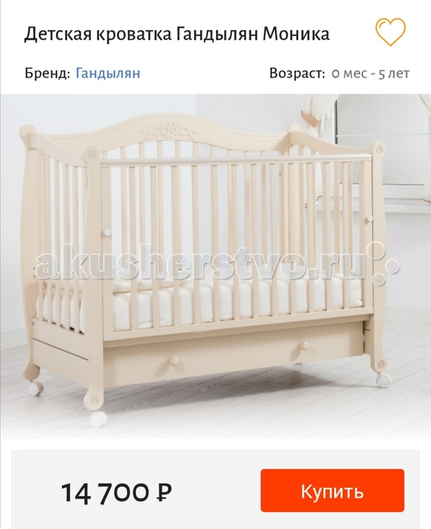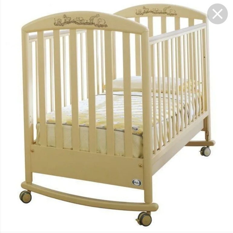 Потом начала выбирать кроватку. Я долго изучая определила критерии по качеству: материал обязательно бук, с ящиком, на колёсах, с 2мя уровнями дна, с опускающейся стенкой. Качалки для меня были не особо важны. Ну и по виду, была мечта, что кроватка будет белая, с изгибами, как у принцессы. Этим требованиям соответствовала модель в гандылян "Моника".