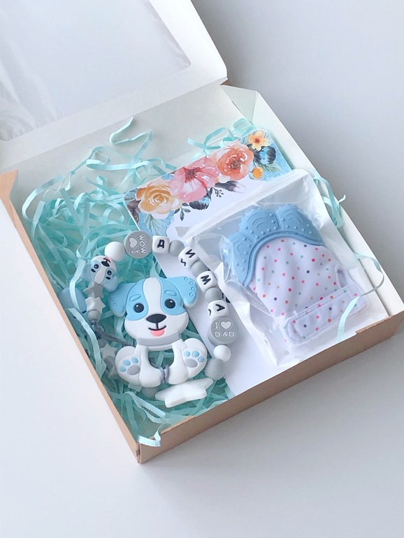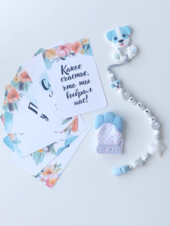 Держатель с прорезывателем, шуршащая варежка- прорезывытель и набор карточек для фото