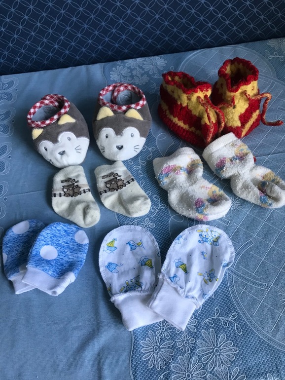 Злате: подгузы (6 шт., huggies, libero, merries - вот и попробуем какие нам подходят), шапочка без завязок (2 шт.), носочки (положила 4 пары разных - хз какого у неё размера будут ножульки и как будет в палате), две пары антицарапок. Фотки ниже.