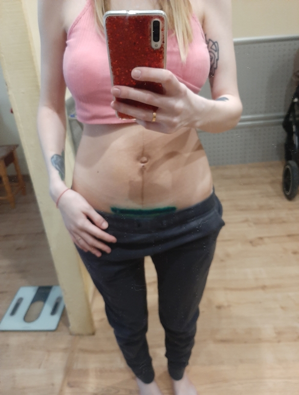 Кожа пока, конечно, немного не в тонусе, но выглядит все прилично. Шов не беспокоит, обильно мажу зелёнкой 2 раза в день по рекомендации роддома)