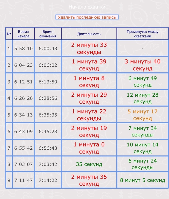 Понемного схватки начались болезненные. Малыш между схватками немного пинается - видимо страшновато как и мне. Сейчас включила схваткосчиталку. Лежу считаю, чтобы не ошибиться и точно определить, что рожаю.