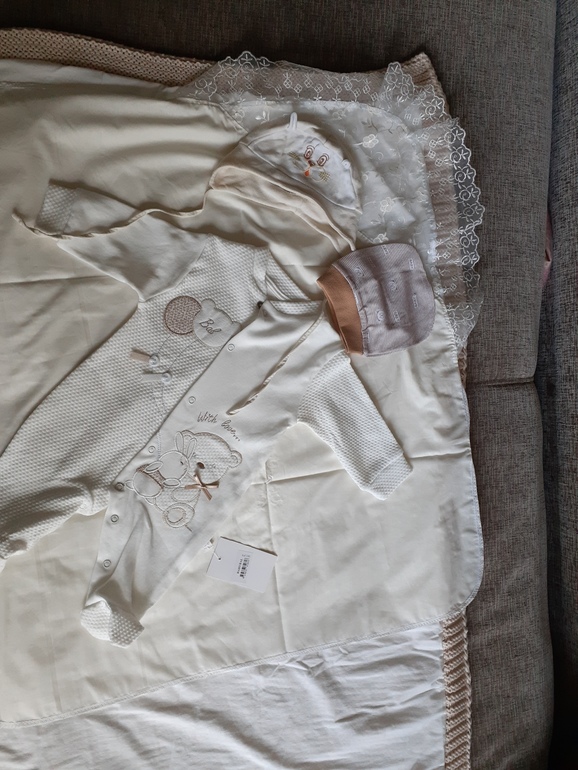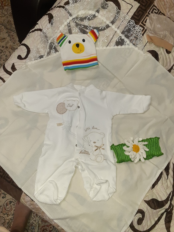 Я подготовила 2 варианта одежды (на разную погоду, на всякий случай): бодик + штанишки или человечек. Запаслись еще утепленным человечком на всякий случай + плед). По погоде уже решим что одеть ))