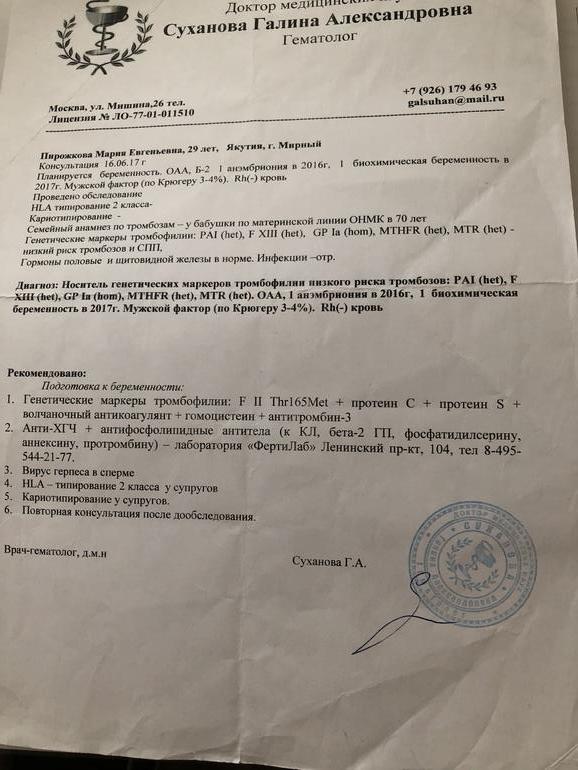 Гемостаз3 зб. Дальше много букв. Первая случилась в 2016-5-6 недель, не было эмбриона и деформированное плодное яйцо. Медикаментозное прерывание. Потом была бхб в Марте 2017 . В сентябре 2017, после 3 лет планирования я забеременела и благополучно родила сынишку. Беременность протекала хорошо, роды на 41 неделе,стимуляция. Начали планировать 2 ребёнка. Спустя 9 месяцев- В Марте 2020 ЗБ срок 5 недель. Чистка. На свой страх и риск попытались в мае. Не думали что сразу получится. Эмбрион появился и сердечко билось. Гематома была,мазня, но потом она вышла, меня подбодрили, что все хорошо. В этот же день потекла алая кровь. На следующий день вердикт. Сердцебиения нет. А ещё вчера было 176,срок 7-8 недель. Сколько раз это можно вынести,я не знаю. У мужа была плохая Сг, в частности морфология по Крюгеру 3%,у меня мутации . Вот по ним и вопрос. Гематолог Суханова назначила до 1 благополучной беременности анализы. Но так как все получилоось,я забросила это дело. Какие из этих анализов нужны,если уже ЕСТЬ совместный ребёнок,вопреки всем Крюгерам и мутациям, проскочила просто на курантиле,но теперь понимаю, это было Чудо и все не так просто.