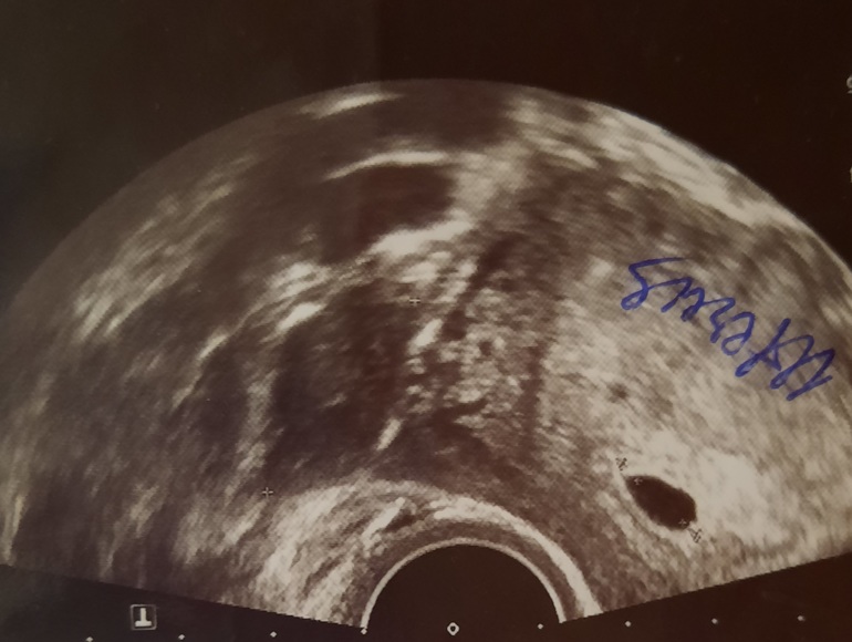 На снимке с УЗИ слева) в заключении не написано, просто по передней стенке
