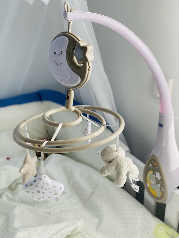 3. Мобиль в кроватку (почему-то у него розоватая штанга, хотя на картинке по идее серо-бежевая, но нас с мужем это не особо смущает):
