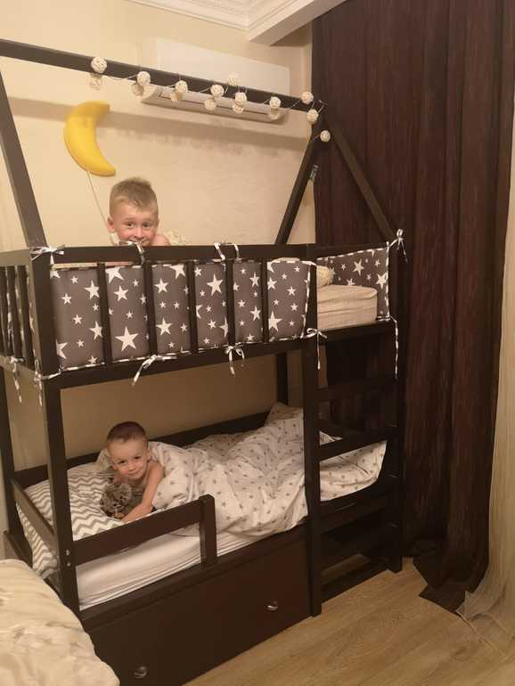 Для встречи с малышом все готово: вещи лежат в ящике, сумки собраны, кроватку освободили, муж сделал в нашем домике первый этаж для младшего сына, теперь они спят так: