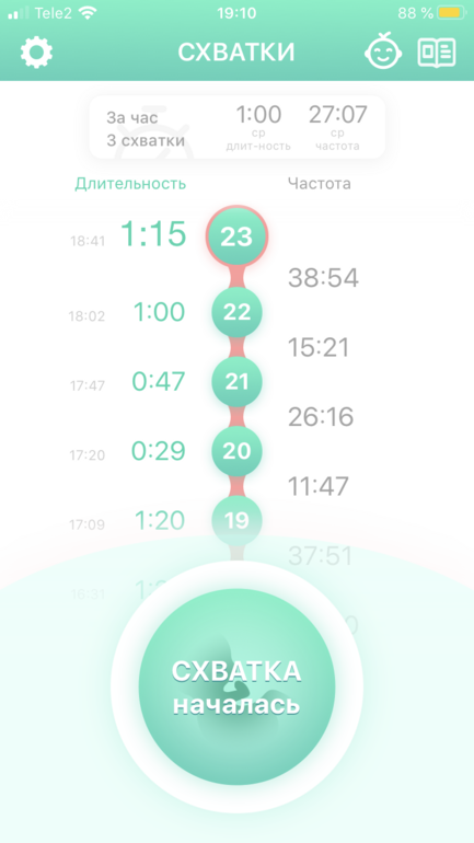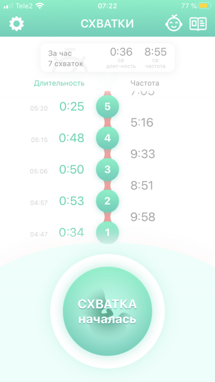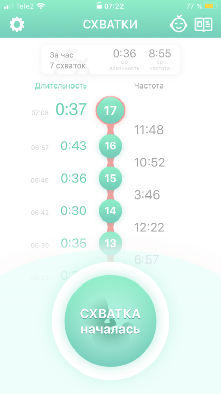 Через три такие схватки я включила счетчик схваток. Вроде как поначалу вырисовывалась неплохая картина начала родов, приложение писало собирать вещи и потихоньку готовиться выезжать в роддом.
