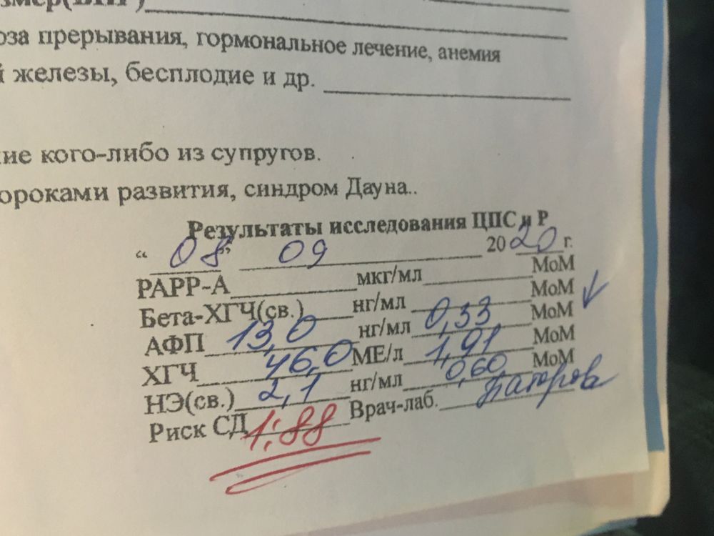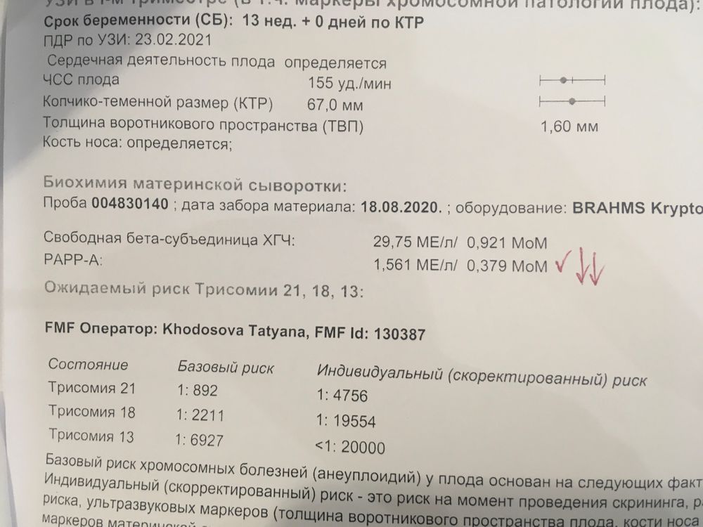 А сейчас тоже АФП низкий, ХГЧ высокий, и риск СД уже вообще 1:10 запредельный, возможно, в числе прочего - из-за возраста. Но я на всякий случай сделала НИПТ. Тревожно, конечно.