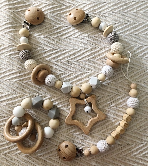Заказ с али пришёл. Тоже всякие мелочи - мобиль (сложенный лежит), грызунок с растяжкой на коляску и с держателем для соски вот этот