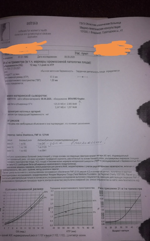 Не вижу я у вас риска 1 из 30 🤷🏼♀️, вижу 1 из 247, ничего критичного. Может вы не так расслышали? У вас все хорошо по скринингу, кроме слегка завышенного ХГЧ, но ПАПП в норме, так что риски не такие и высокие, и то как вам написали ниже, они выше изза возраста. Генетик вам все расскажет, но вы пока успокойтесь, ничего критичного у вас нет