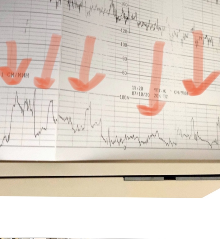 Вот стрелочкой это получается сокращения матки. Если бы линия была прямая то их нет, у меня ктг не фиксирует в жк и получилось что была прямая линия, сейчас покажу фото
