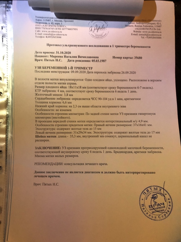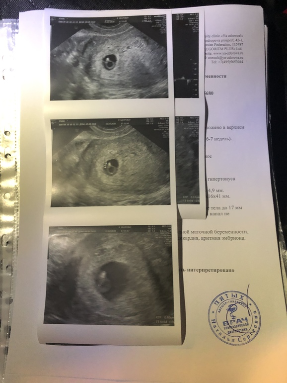 УЗИ, КТГ, доплерДобрый день всем неравнодушным. Моя история такая: первое ЭКО со свежим переносом. Дней за 5 до узи пришёл результат анализа по гормонам: ТТГ - 11,11! Сильно поднялся очень и Т3 и Т4 не в норме тоже. В общем эндокринолог назначила эутирокс 88. Узи в 6 акушерских недель и 5 дней - не нашли сердцебиение, сказали, что шансов нет особо. Переделываю узи в 7 недель и 3 дня (это было вчера) и о чудо: появилось сердцебиение, правда аритмия и слабенькое пока 90-104 уд. В мин. отставание на неделю с небольшим в размерах, кровоток нормальный. В общем сказали, что шансы есть, что все будет хорошо, но и печальные случаи тоже есть. Спросила у своего репродуктолога, нужно ли чем-то помогать: анализы или препараты, ответила, что нет, все зависит от эмбриона. Я сначала решила прочитать информацию тут о подобном, нашла только про Капельницы Курантила и Озона. В общем пишите, кто с таким сталкивался: надо просто ждать или можно чем-то помочь и была ли у кого-то подобная ситуация? Может ли это отставание быть связано с высоким ТТГ например? Протокол последнего узи прилагаю.