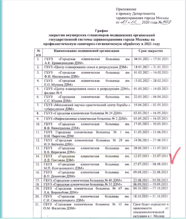 ЖК / Лечащие врачи / Курсы для БДевочки, такая проблема: не могу найти график закрытия роддомов Москвы на мойку на 2021 год, везде выложен прошлогодний, на 2020. Его же по идее уже должны были утвердить. Знаю, что обычно они из года в год совпадают по датам, но хочется знать точно. Может, кто-то находил?