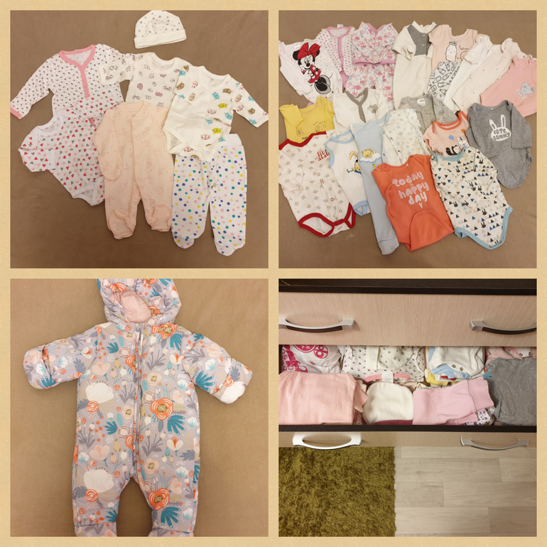Одежды полный комод, многие вещи нам отдали в идеальном состоянии, но почти все 62 размера. Мы докупили на первые пару недель боди и слипики маленького размера (50 и 56). И демисезонный комбинезончик для прогулок. Еле удержалась, чтобы не скупить весь магазин, все такое крошечное и мимишное 💕