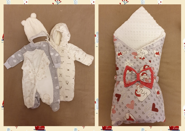 Комплект на выписку тоже готов. Нейтральных цветов. Х/б слип 50 размера, флисовый слип 56 размера, демисезонный комбез-мешок и зимнее теплое одеялко. Надеюсь, что не замерзнет) Одеяло, кстати, шила будущая прабабушка. Она очень хотела вложить частичку своего тепла в это важное мероприятие. Бабулечке 81 год, ещё понянчит правнучку)