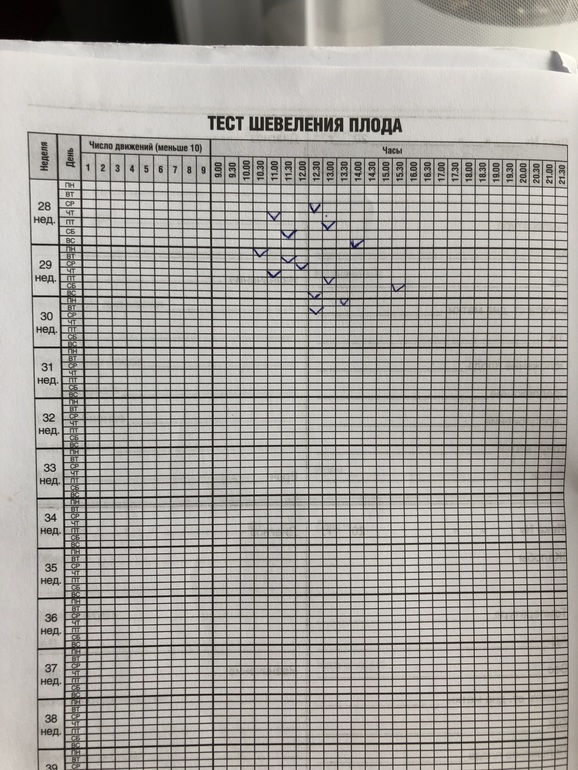 Есть таблица и с 9:00 ты до 21:00 считаешь 10 шевелений.Как 10й раз шевельнулся,ставишь галочку у того времени(во сколько оно было) и все,потом не считаешь)