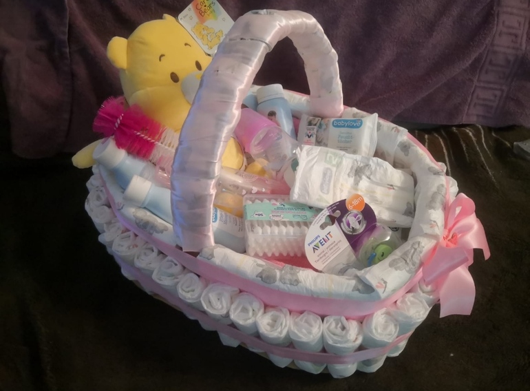 в первую ложила всё что может пригодиться на первое время, а с букетом уже конвертик с деньгами