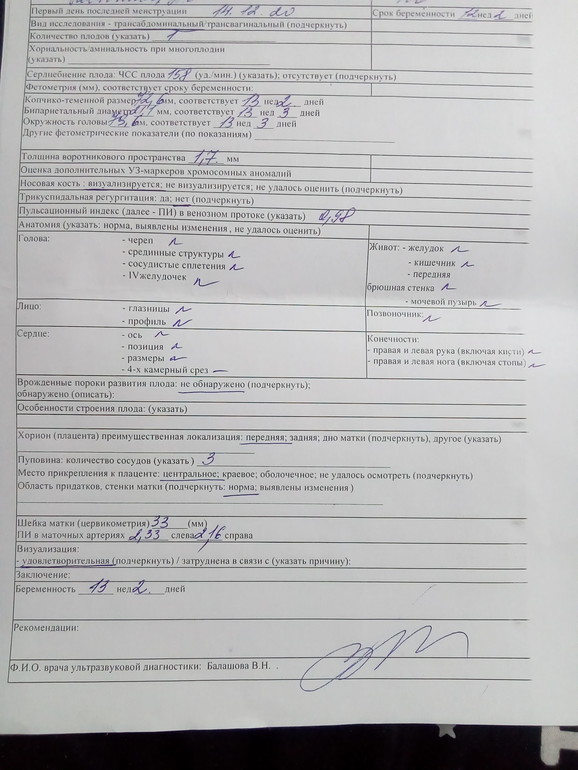 Сегодня на скрининге всё хорошо с ребёнком, также опережает на 1 неделю, по М 12+2, по УЗИ 13+2, предположили девочку, но не точно, так как сидит на пуповине и плохо видно, ручки за голову спрятал.