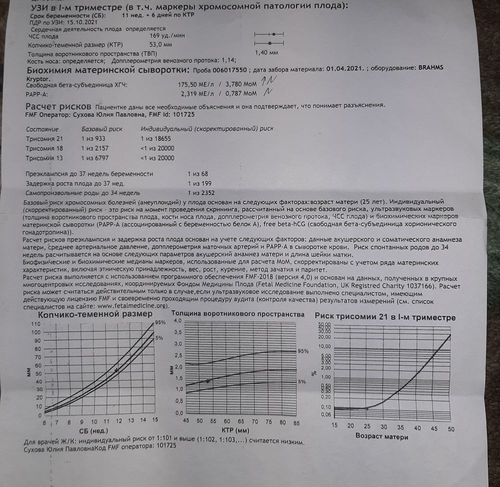 По УЗИ норма: КТР 53 мм, ТВП 1.4, носовая кость 1.7 мм