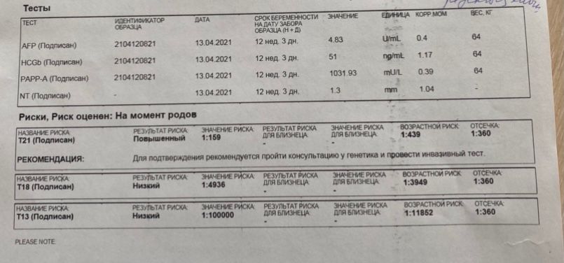 Девочки, мне сообщили на почти 16 неделе , что риск по 1му скринингу СД 1:159 ( прилагаю результат), мне 34, узи в 12 недель -все хорошо, воротниковая зона 1,3, сделала сейчас узи в 16 недель -тоже маркёров не выявлено , предлагают амнио, сегодня сдала нипт, поделитесь своими историями -у кого так было и все хорошо или наоборот 😕результаты скрининга прикрепляю