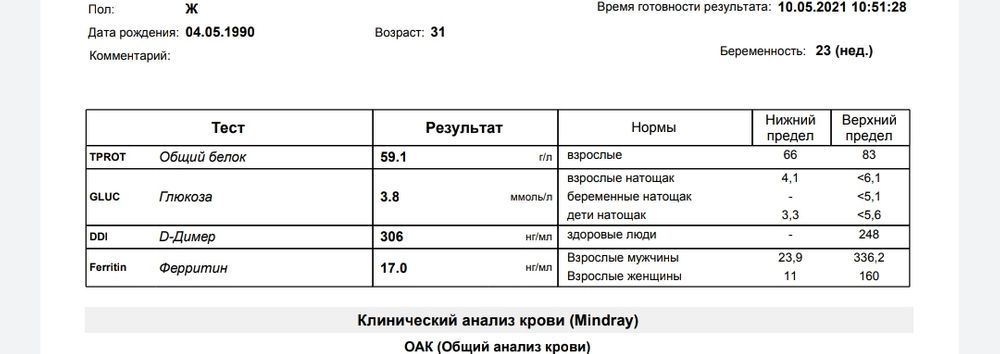 Также прикладываю часть остальных анализов с Д-димером. Тут он выше нормы по версии моей лабы, но по-моему у них нормы указаны для небеременных.