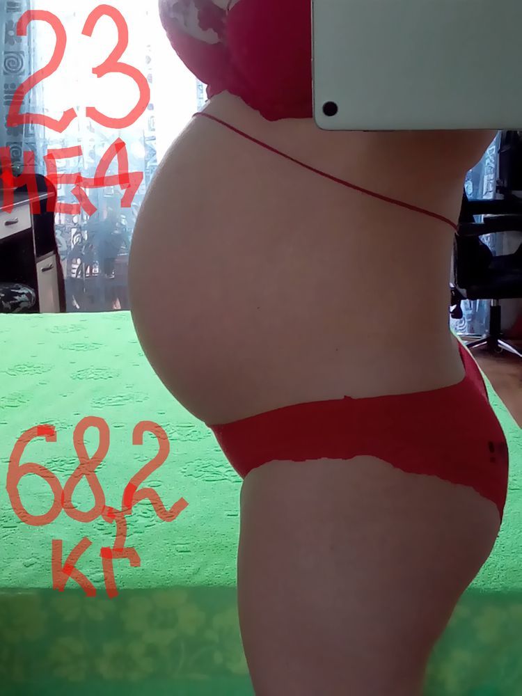 23 недели, прибавка 9 кг уже, отеки если и есть, то скрытые, живот тяжело носить и ноги устают. ОЖ 94 см, ВДМ 27 см, малыш пиннается выше пупка очень активно