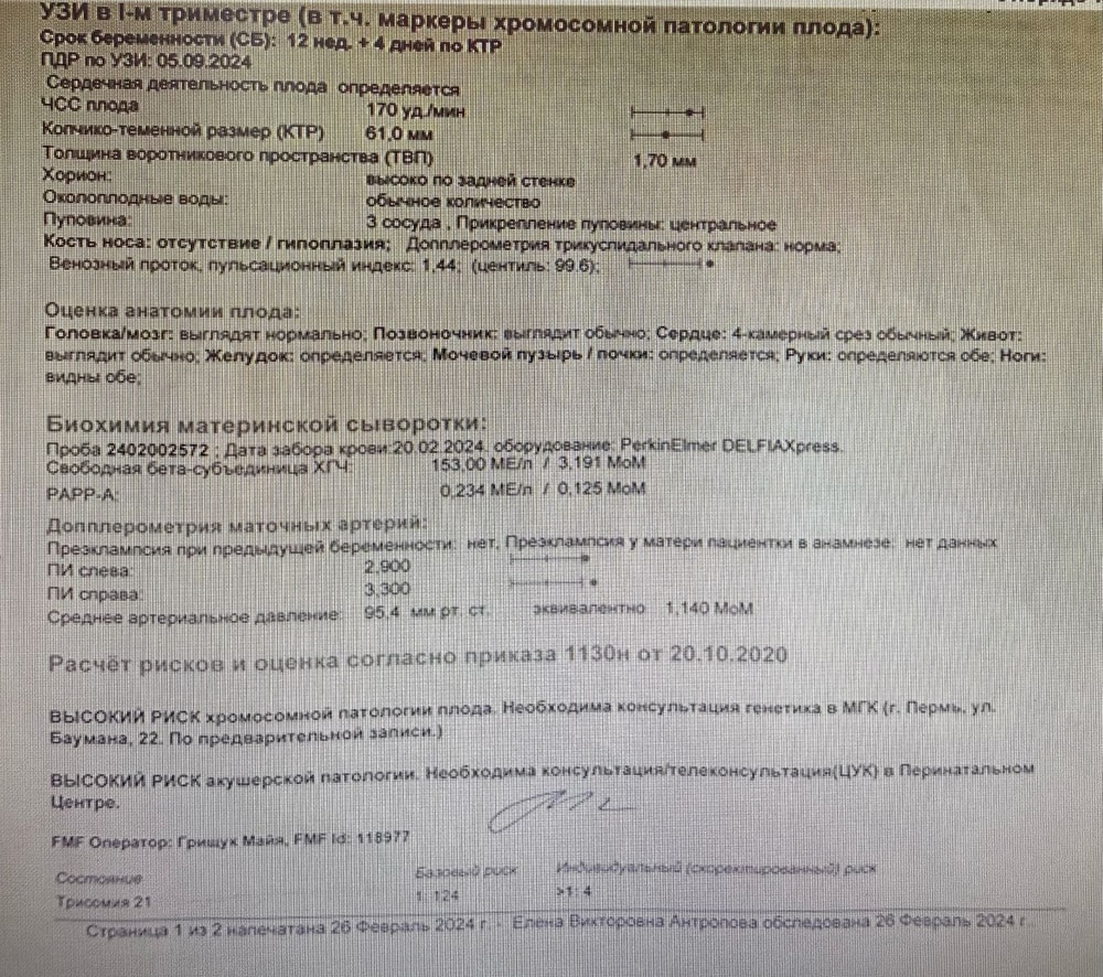 Как вы знаете он проходит 11-13 недель беременности. Состоит из 2х этапов: УЗИ и в этот же день анализ крови. Мой первый скрининг был 11 недель 5 дней, по УЗИ всё в норме. Анатомия-норма, носовая кость визуализируется, ТВП 1,4мм – норма, на УЗИ маркеров не найдено. Результаты анализов пришлось ждать 4 дня и по ним пришло заключение ХГЧ 153,00 МЕ/л / 3,191 МоМ; РАРР-А 0,234 МЕ/л / 0,125МоМ……… При расчете рисков (через программу Astria) мне поставили индивидуальный риск хромосомной патологии плода на трисомию 21 хромосомы (синдром Дауна) 1:4 и назначили консультацию генетика. (1:4, Что? Как так, почему? Начитавшись форумов , там все паникуют при результате 1:124, но я не из паникеров).