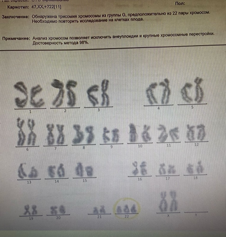 К генетику я попала со сроком 12 нед. 4 дня. Там мне объяснили что риски очень высокие, на данном этапе можно сделать забор генетического материала (биопсия хориона, что бы наверняка подтвердить или опровергнуть предварительный диагноз. Я сдала нужные анализы перед процедурой и через неделю прибыла в больницу на 3 дня , на второй день мне сделали прокол (1.03)(13-14 недель), через сутки повторное УЗИ и выписка. Анализ готовится 10 дней. Мне позвонил генетик и ошарашил что патология по 21 хромосоме не подтвердили, но нашли три хромосомы 22, достоверность 98% и пригласили на консилиум, что бы на нем принять решение прерывать беременность или рожать ребенка с хромосомными аномалиями.