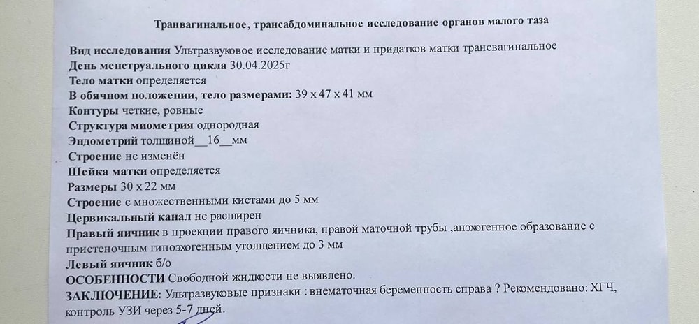 в общем: последние Месячные были 30апр-4мая. Дальше с 5 по 19 были бурные ночи с мужем) 27мая должны были пойти Месячные (идут как по часам всю жизнь) - не пошли. 29го сделала тесты-слабая розовая вторая полоска на каждом. Паника. 30го мая Поехала на узи (частная клиника) - эндометрий 16мм, в матке пусто, в проекции правого яичника правой маточной трубы анэхогенное образование с пристеночным гипоэхогенным утолщением 3мм