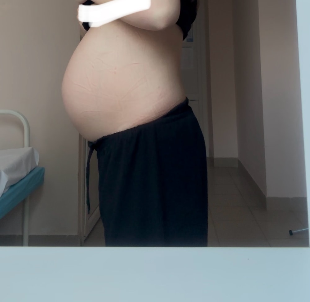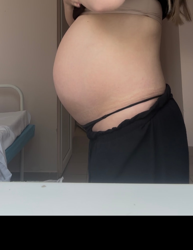 Живот высоко на обоих фото. Когда опускается ребёнок,то живот сверху полностью уходит и даже легко дышать.