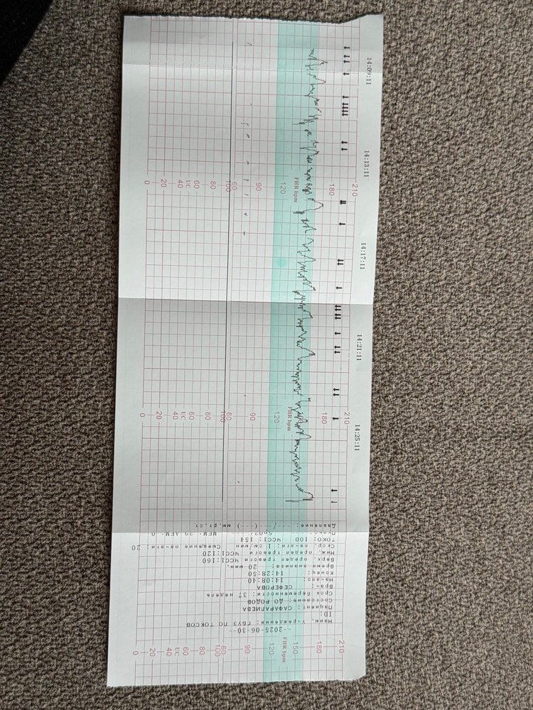 ЧСС в пределах нормы, повышения при активности видны. Так, на непрофессиональный взгляд, нормальное КТГ.