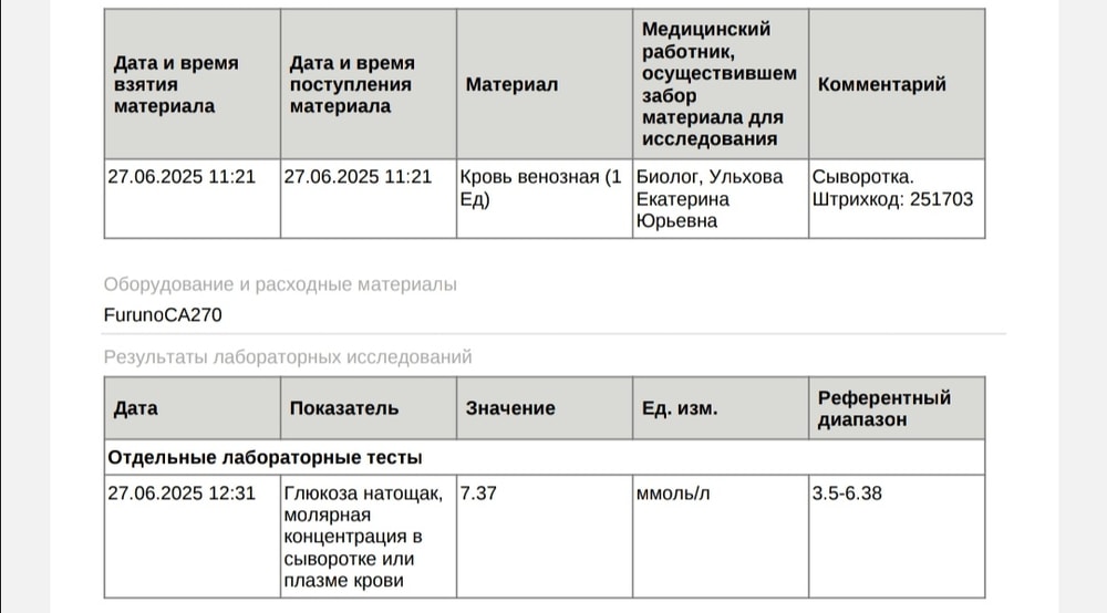 Ирина Лапина, ну они скорее всего не раз в лабораторию отправляют анализы, у нас лаборант несколько раз приходит и забирает. Чего гадать, дождитесь остальных результатов. 7,37 натощак это уже СД, а не ГСД.