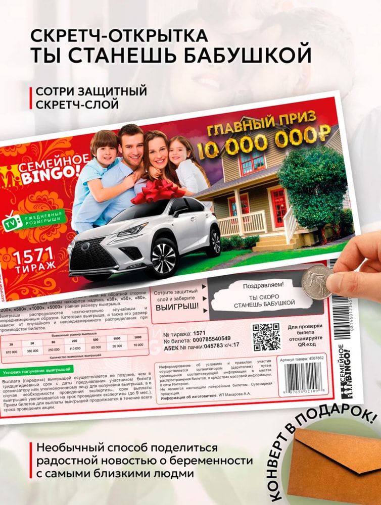 Свекрови и др.родственникам мужа за новогодним столом как раз вручали такие лотерейные билеты и все одновременно их стирали)) Эмоций было много) Свекровь не одела очки и в итоге не сразу поняла что к чему)) Пришлось говорить словами 😅