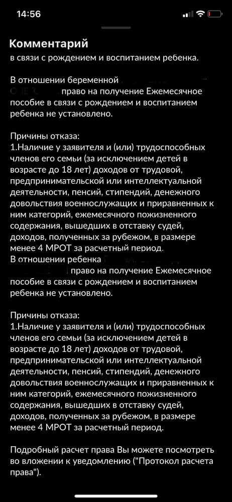 Анна в Благополучная беременность 5 месяцев Пособия Выплаты, пособия, сертификат, обменка Девочки , ну расшифруйте мне пожалуйста , я в этом не сильна , своими словами 😁🥹причина отказа ? Посмотрите еще 20 записей на эту тему Отменить Ответить NG Муж работает официально? 09.07.2025 Ответить Анастасия вы должны быть трудоустроены с супругом, или иметь причину не работать... 08.07.2025 Ответить Оксана Там еще электронный документ есть,должно быть конкретно указано на сколько и что превышает За 12 месяцев было меньше 4 мрот по одному из пунктов. 08.07.2025 Ответить Мурмяу Кто-то из членлв вашей семьи , возможно вы не работаете официально. 08.07.2025 Ответить Из декрета в декрет Дистанционное открытие ЛН Чаты Беременных Выберите чат: Январята-2026 Февралята-2026 Мартята-2026 Апрелята-2026 Майчата-2026 Июнята-2026 Июлята-2026 Августята-2026