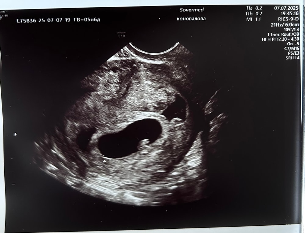 Мне с такой наподобие картинкой во время 4й беременности на 8й неделе предположила гематому или неразвившуюся вторую беременность. Через 2 недели назначили контрольное ухи, всё исчезло.